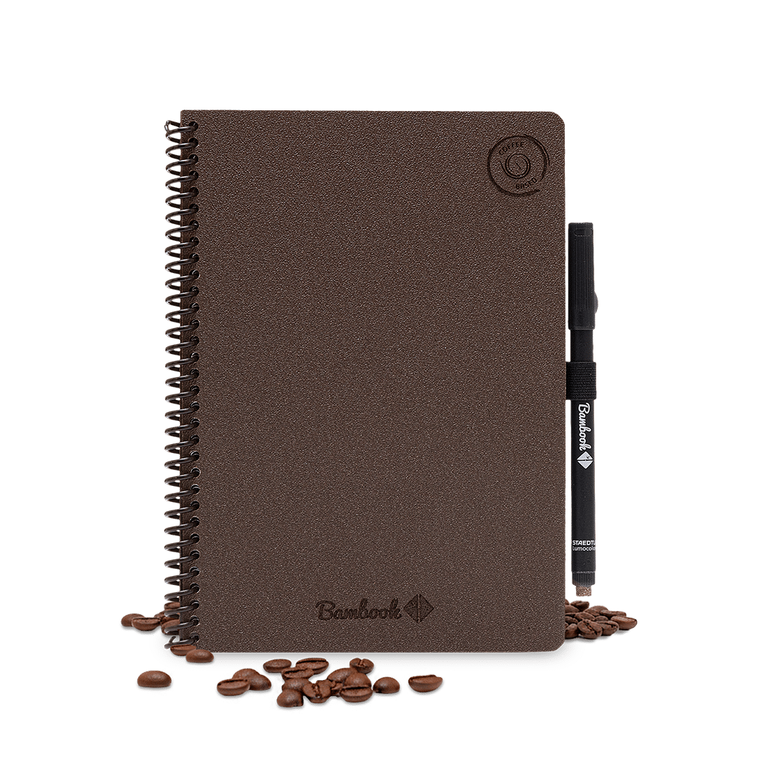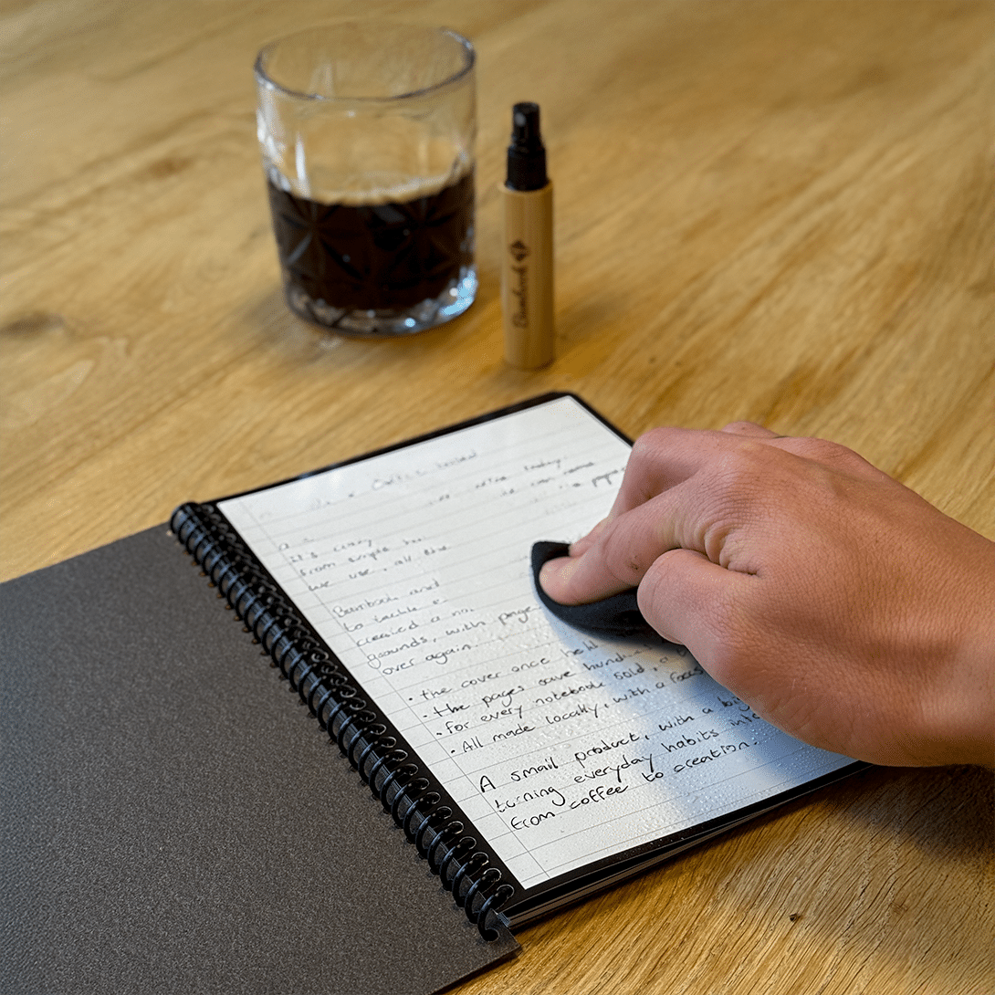 Een goed idee begint met koffie. En met dit circulaire notitieboek kun je het meteen vastleggen. In samenwerking met Bambook maakten we een herschrijfbaar notitieboek met kaften van koffiedik.