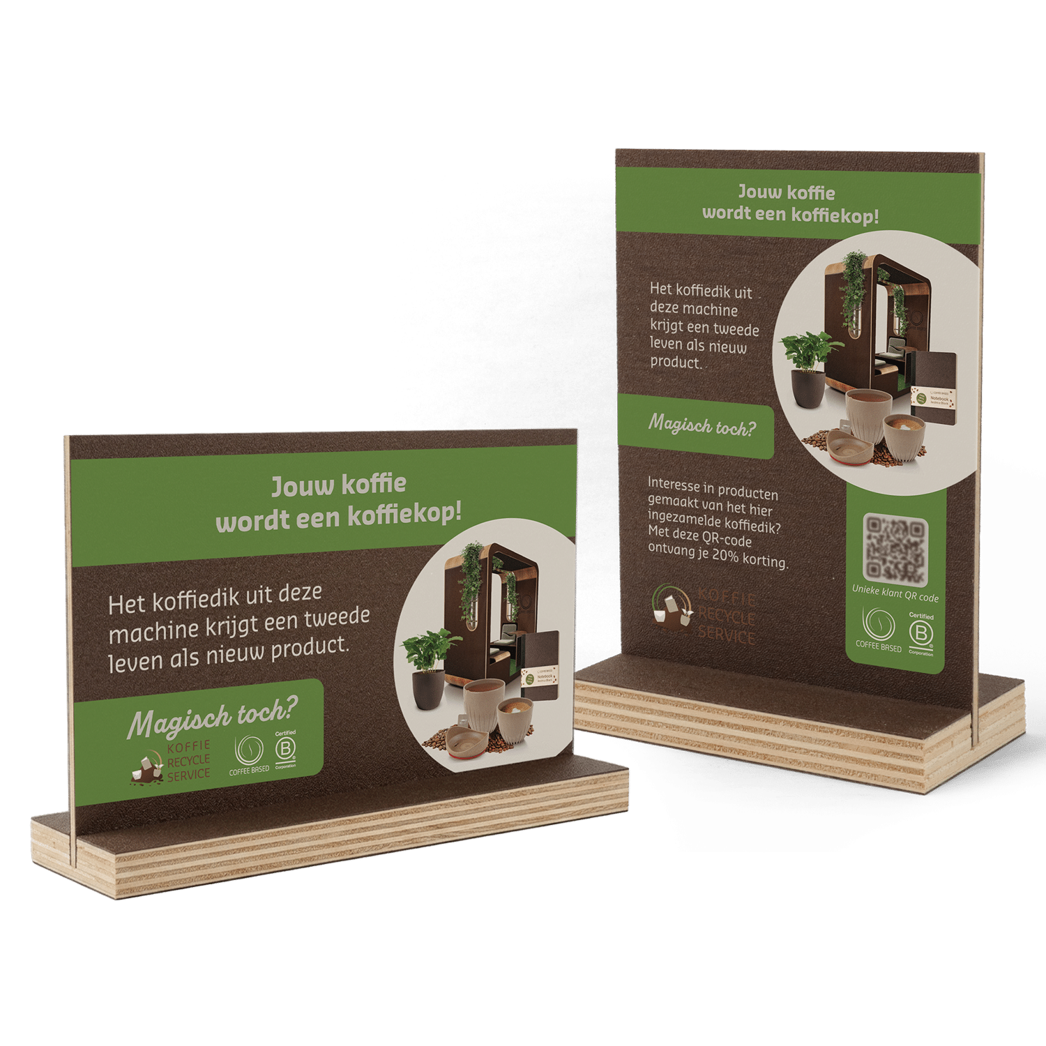Laat je medewerkers meeprofiteren! Met dit bordje, gemaakt van koffie, maak je de Koffie Recycle Service zichtbaar voor collega’s en bezoekers.